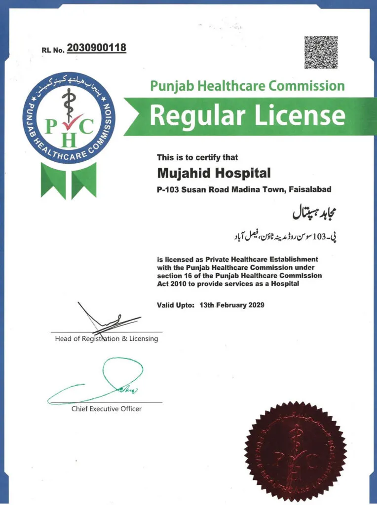 Certified by the Punjab Healthcare Commission, we strictly adhere to clinical governance, service quality, and patient safety protocols as mandated by the provincial health authority.